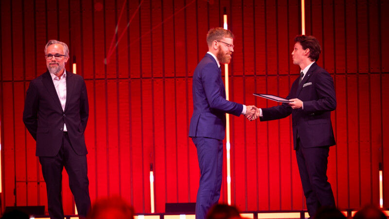 Hvert år udpeger DTU-studerende årets undervisere. I år gik hæderen til Carl Høy Sander Kruse, ph.d.-studerende ved DTU Construct, og Ulrik Engelund Pedersen, studielektor ved DTU Compute. Som årets undervisere modtager de begge et diplom, 25.000 kr. og en lille gave fra PF, der blev overrakt af PF’s forperson Thor Deibert.